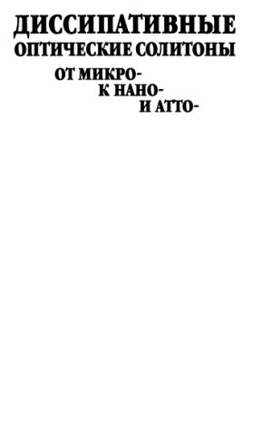 Рассмотрены общие свойства диссипативных оптических солитонов локализованных структур света в диссипативных нелинейно-оптических и лазерных средах и системах с существенным притоком и оттоком энергии. Систематически изложена теория различных типов таких одномерных, двумерных и трехмерных солитонов в пассивных и активных (с усилением), с когерентным или некогерентным поддерживающим излучением, безрезонаторных и резонаторных схемах. Введены представления о внутренней структуре диссипативных солитонов, их слабом и сильном взаимодействии, внутренней и внешней симметрии и ее связи с движением солитонов и солитонных комплексов (галилеевская, аристотелева и эйлерова механика). Представлена теория диссипативных наносолитонов (наноразмерных солитонах) и аттосолитонов (с длительностью в субфемтосекундном диапазоне). Выводы теории сопоставлены с экспериментом. Обсуждены возможные приложения к проблеме оптической обработки информации. Для научных работников, аспирантов и студентов, интересующихся современными проблемами фотоники, нелинейной оптики, лазерной физики, нанотехнологий и обработки информации.