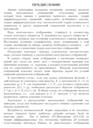 Книга посвящена изложению теории многозначных отображений. Содержит основные разделы этой теории: метрики, топологии в совокупности подмножеств банаховых и метрических пространств, пределы, непрерывности и полунепрерывности, измеримость многозначных отображений, однозначные непрерывные (измеримые) ветви многозначных отображений. В книге описаны результаты автора по теории интегралов типа Римана и типа Лебега от многозначных отображений. Изучены свойства производных многозначных отображений, получаемых с помощью касательных конусов к графику многозначного отображения. Доказаны свойства решений дифференциального включения со значениями в банаховом пространстве, в том числе теоремы существования решений дифференциальных включений и свойства непрерывной зависимости от возмущений множества решений дифференциальных включений с неограниченной измеримо-псевдолипшицевой правой частью. Получены новые необходимые условия оптимальности в оптимизационных задачах с дифференциальными включениями, имеющими неограниченные правые части. Для аспирантов и научных работников, по роду своей деятельности связанных с теорией многозначных отображений, математической теорией управления и теорией дифференциальных игр.